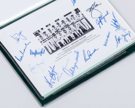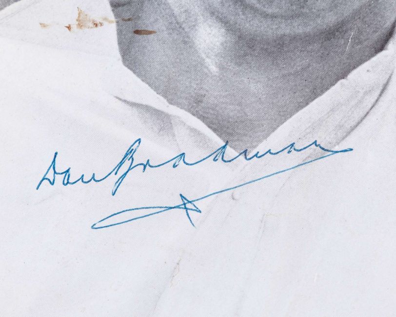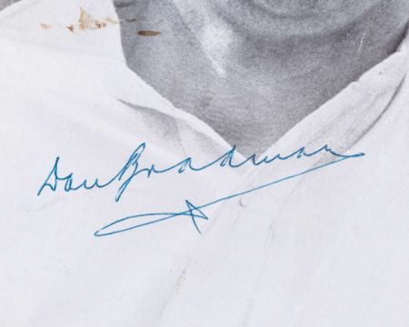 A Don Bradman black and white signed magazine signed photograph, Farewell to Cricket by Don Bradman, autographed, May 1950, commemorative pack from the 1980 England Australia centenary test with signed photos of each team and five autographed miniature bats