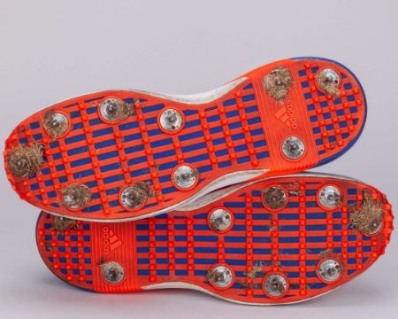 James Anderson blue, white and orange Adidas Adipower Lancashire County Cricket match worn autographed spikes, UK11, with JA (England flag) decal, with signs of wear and COA from LCCC Foundation