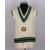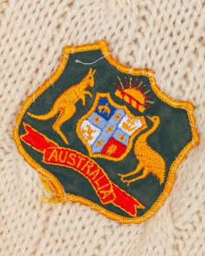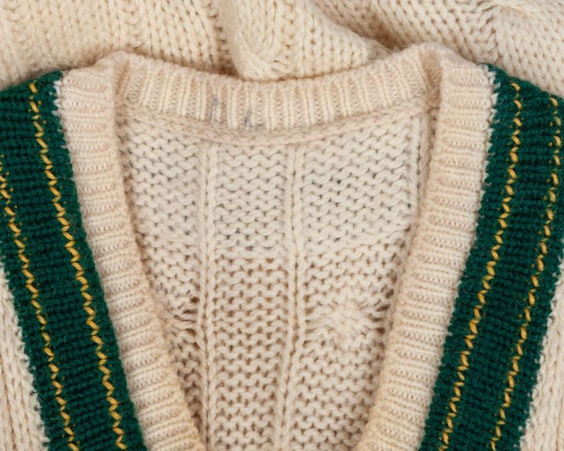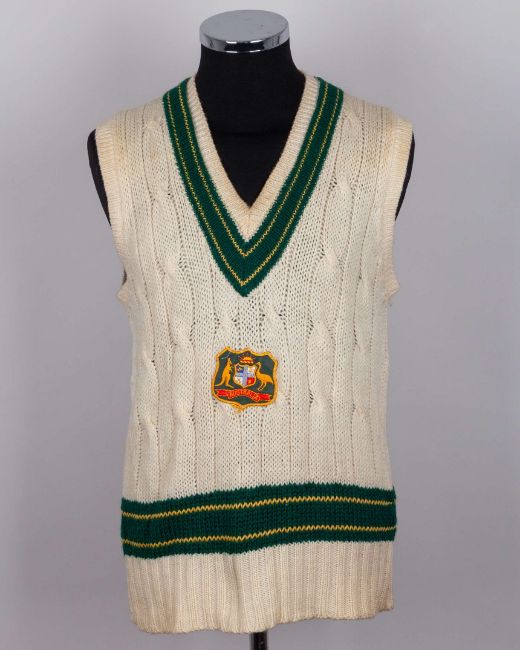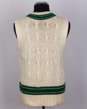 Dennis Lillee white Original Australia woollen worn sleeveless sweater, 1980s, with embroidered cloth badge, with Australia colours of green and gold to neck and waist, initials ‘D.L.’ handwritten to inside collar, the sweater was gained by Ian Botham as swap