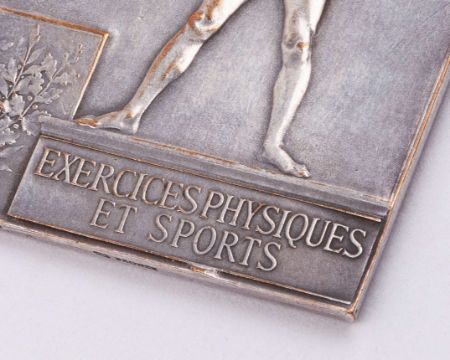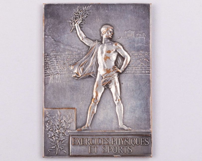 Paris 1900 Olympic Games presentation plaque, designed by F. Vernon with a victorious athlete standing on podium, inscribed EXERCISES PHYSIQUES ET SPORTS, the reverse with Victory casting laurel from the sky over Paris, inscribed REPUBLIQUE FRANCAISE, PARIS 1900, EXPOSITION UNIVERSELLE.