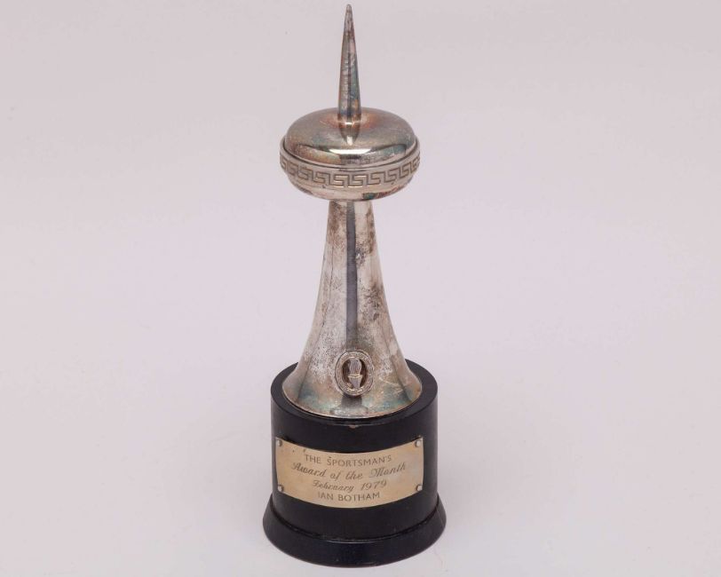 Ian Botham - a silver-plated Sportsman of the Month Award, 1979, with white-metal plaque inscribed THE SPORTSMAN'S Award of the Month, February 1979, Ian Botham, 26cm high
