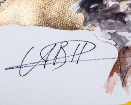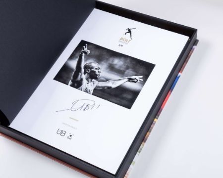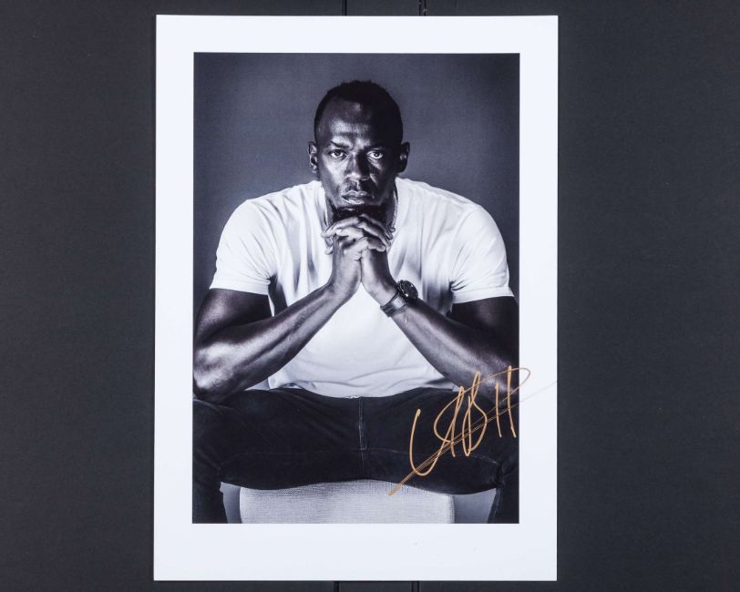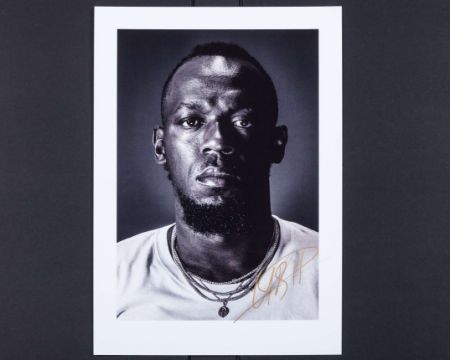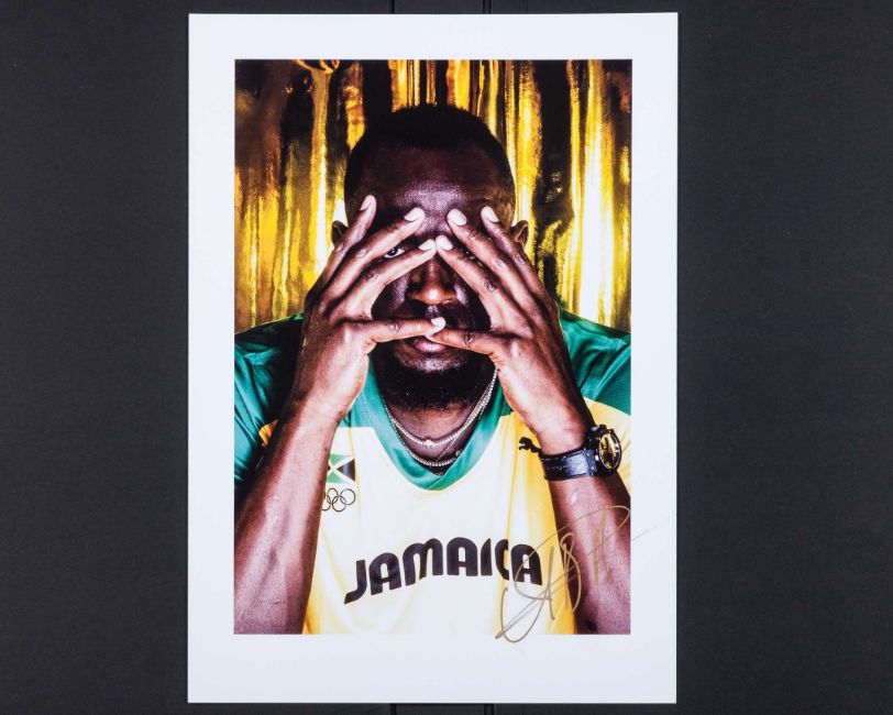 Usain Bolt an extremely rare limited edition Usain Bolt Olympic Gold Edition Opus, No.2 of a limited edition of 8 only, the cover hand-inlaid with gold and black coloured crystals, with Usain Bolt Lightning Silhouette, handmade case, the Opus autographed by Usain Bolt, with additional original autographed watercolour and three signed prints, Opus includes original gloves, 66 x 48 x 8cm