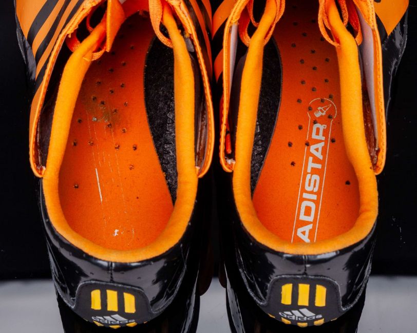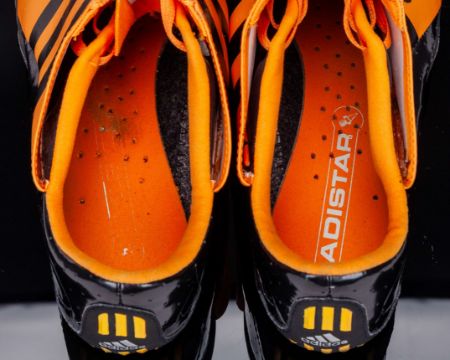 Dwain Chambers autographed orange and black Adidas Demolisher World Athletic Championship worn sprint spikes, 2009, UK11, the right shoe autographed best wishes, with display case and COA