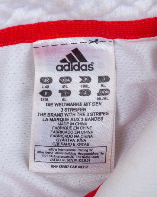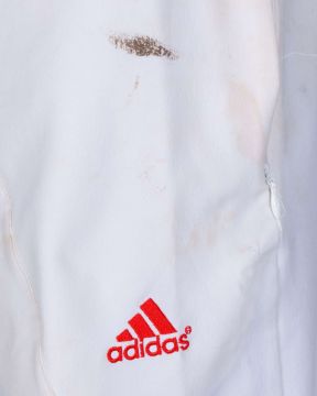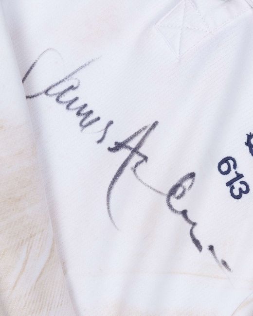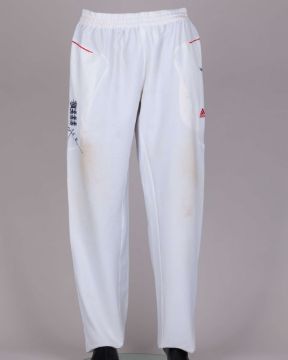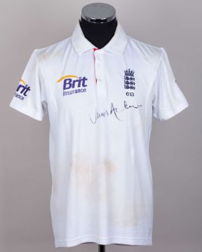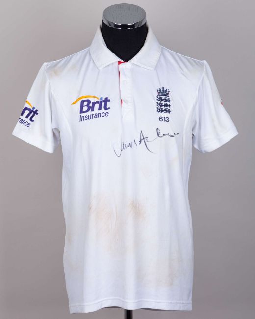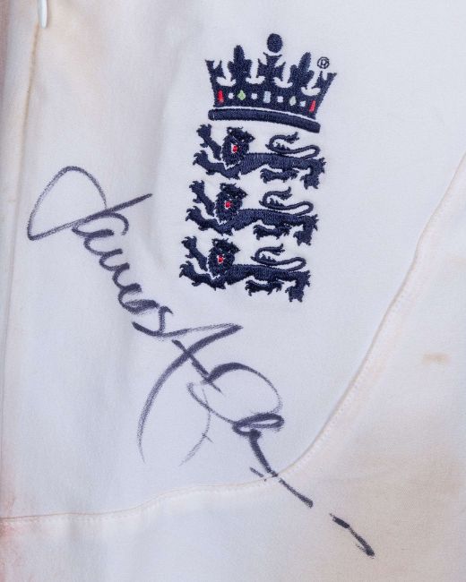 James Anderson England v. India Test series match worn autographed cricket whites, 2011, Adidas, L40, with button-up collar and embroidered badge inscribed 613, with the left sleeve inscribed JA, autographed on the front, with pitch staining, matching Adidas autographed trousers, 34"L, with embroidered badge, pitch and ball staining