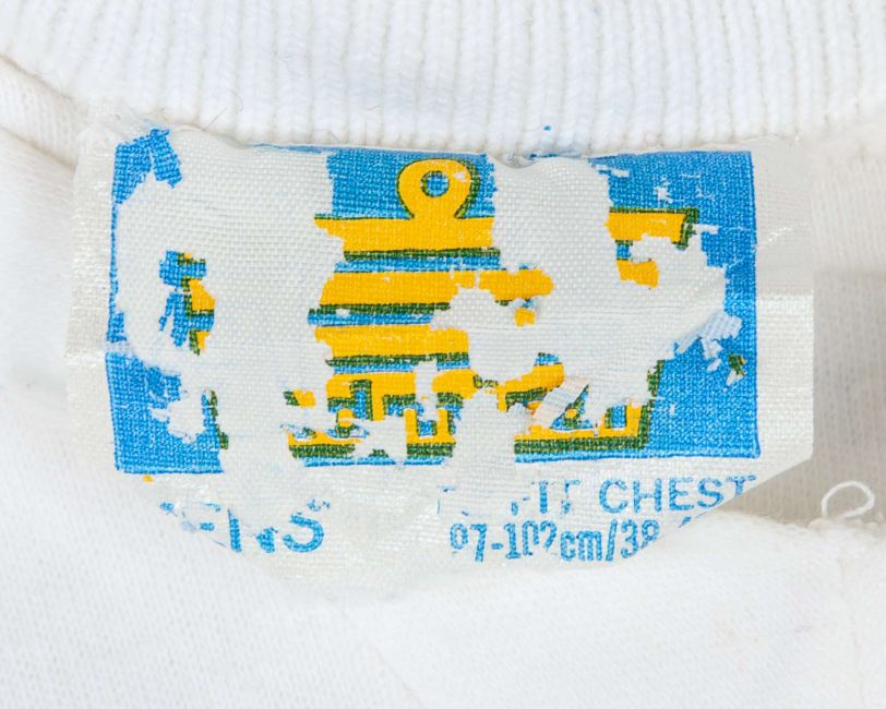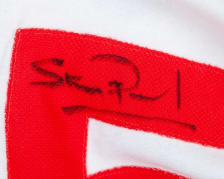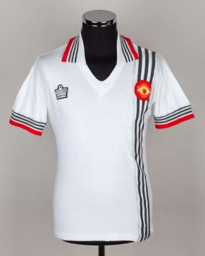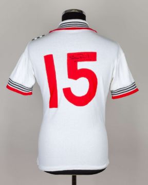 Stuart Pearson rare white, red and black No.15 Manchester United short-sleeved shirt, 1975, Admiral, 38/40, with v-neck collar and embroidered cloth badge, inscribed MANCHESTER UNITED FOOTBALL CLUB, the number autographed by Stuart Pearson, some staining throughout
