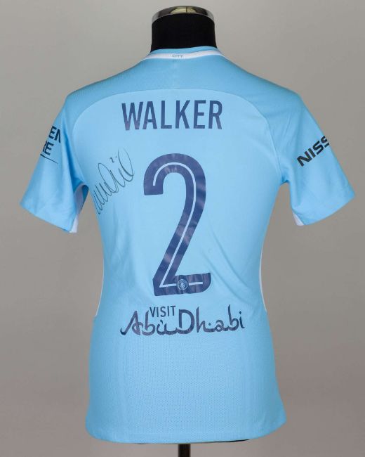 Kyle Walker sky-blue No.2 Manchester City v. Manchester United match worn unwashed short-sleeved shirt, 2017, Nike, M, with crew-neck collar and printed badge, with Manchester Bee decal, loose, the reverse lettered WALKER, the reverse autographed by Walker, with pitch staining, unwashed, with M.C.F.C., COA
