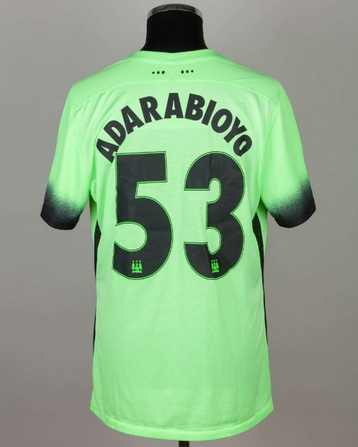 Tosin Adarabioyo green and black No.53 Manchester City v. Chelsea F.A.Cup quarter-final match worn short-sleeved shirt, 2016, Nike, XL, with crew-neck collar and embroidered cloth badge inscribed M.C.F.C., the reverse lettered ADARABIOYO