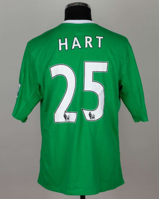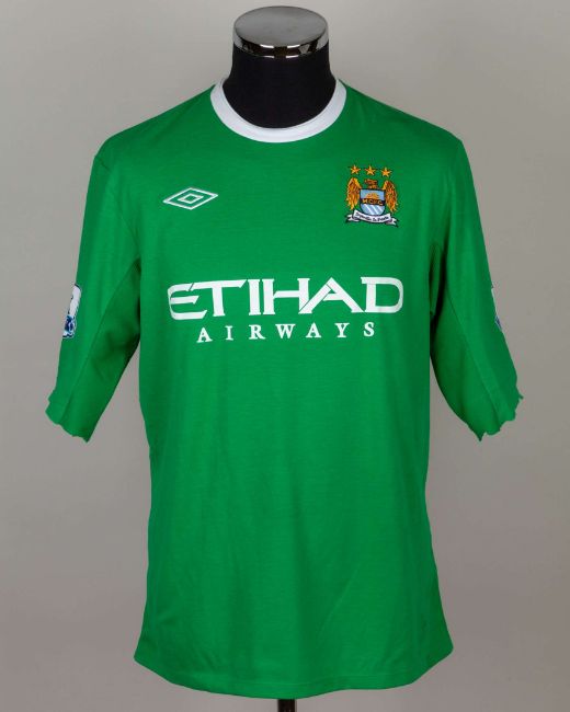Joe Hart green No.25 Manchester City match worn goalkeepers shirt, 2010-11, Umbro, 42, with crew-neck collar and embroidered cloth badge inscribed M.C.F.C., the sleeves cut, the reverse lettered HART, the sleeves with Barclays Premier League flashes, with pitch staining