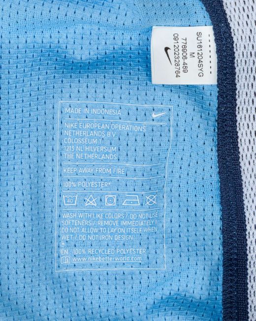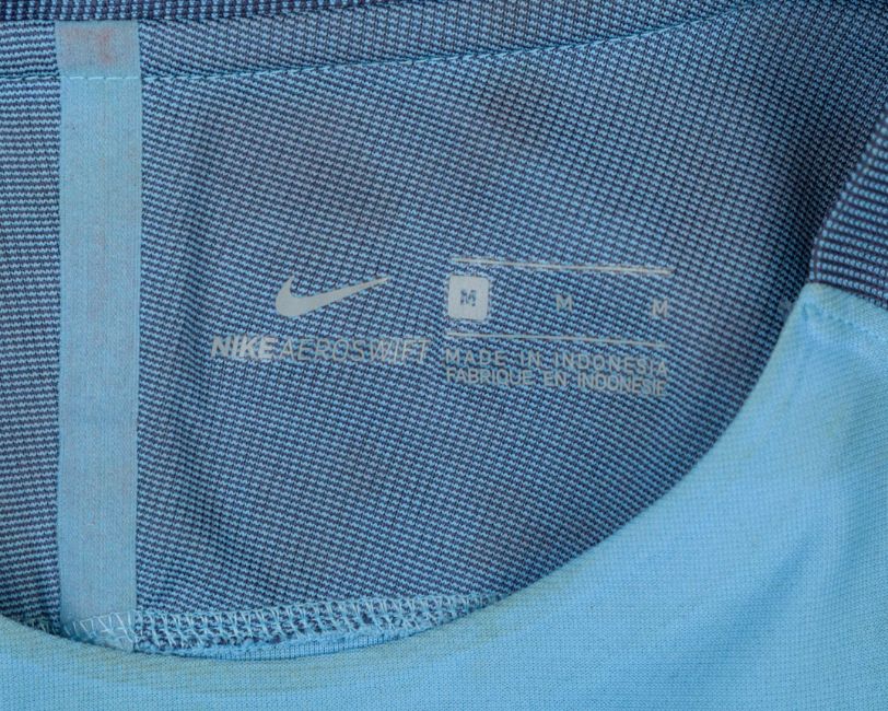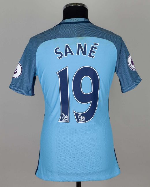 Leroy Sane sky-blue No.19 Manchester City v. Bournemouth match worn short-sleeved shirt, 2017, Nike, M, with crew-neck collar and printed badge, the reverse lettered SANE, the sleeves with Premier League, with pitch stains, unwashed