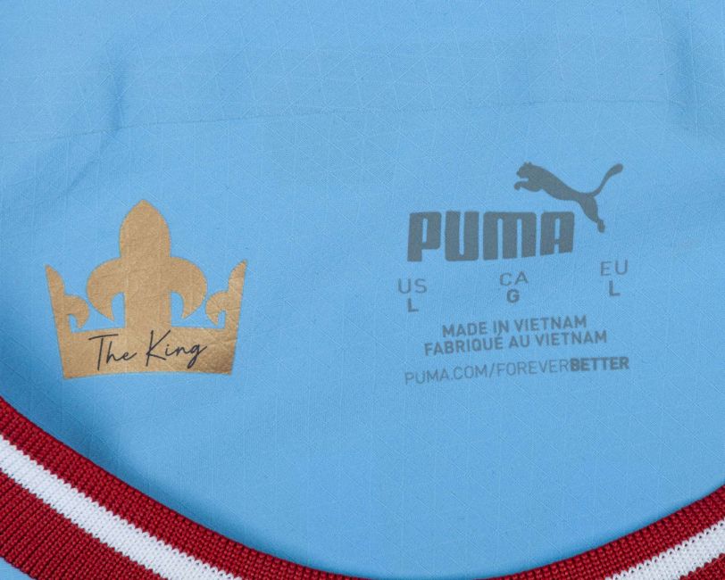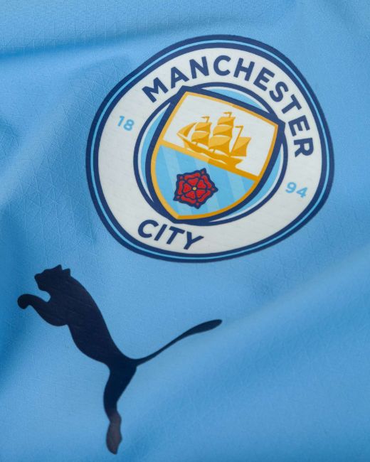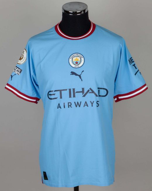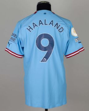 Erling Haaland sky-blue No.9 Manchester City match worn short-sleeved shirt, 2022-23, Puma, L, with crew-neck collar and printed badge, the reverse lettered HAALAND, the right sleeve with Premier League Champions 2021-22 flash