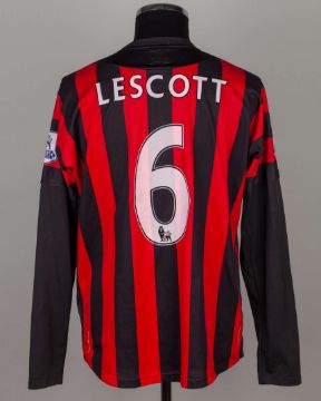Joleon Lescot black and red No.6 Manchester City v. Fulham match worn long-sleeved shirt, 2011, Umbro, 46, with crew-neck collar and embroidered badge inscribed M.C.F.C., the reverse lettered LESCOTT, the sleeves with Barclays Premier League flashes
