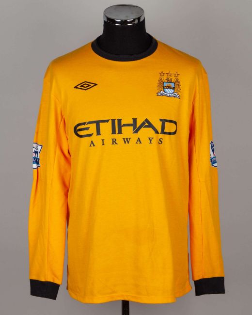 Stuart Taylor yellow and black No.12 Manchester City match issued goalkeepers shirt, 2010-11, Umbro, 44, with crew-neck collar and embroidered badge inscribed M.C.F.C., the reverse lettered Taylor, the reverse also autographed by Taylor, the sleeves with Barclays Premier League flashes