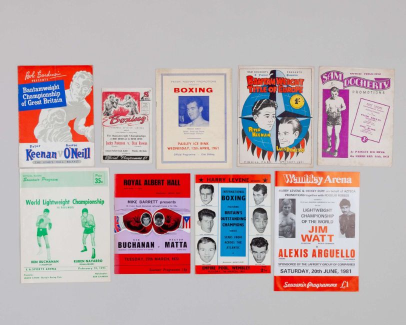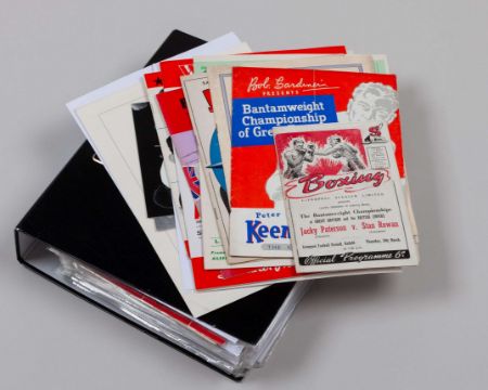 A good collection of Boxing programmes and autographs including Jacky Paterson v. Stan Rowan, 24th March, Peter Keenan v. Jose Rubio, 14th February 1951, Peter Keenan v. Luis Romero, 5th September 1951, Ken Buchanan v. Hector Matta, 27th March 1973, Ken Buchanan v. Ruben Navarro, 12th February 1971, Ken Buchanan v. Jim Watt, 29th January 1973, dedicated and autographed by Buchanan etc and a small collection of athletic signed cards including Alan Wells and Roger Bannister, in arch file (a lot)
