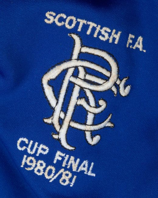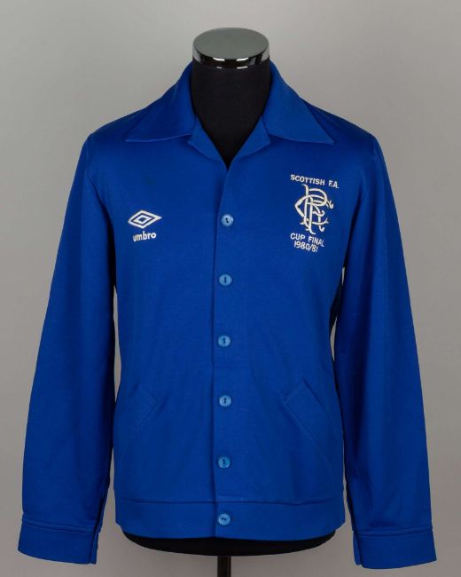 Blue Rangers 1981 Scottish Cup Final worn track suit top, Umbro, Large, with button-up front and embroidered badge inscribed RFC, SCOTTISH F.A. CUP FINAL 1980/81