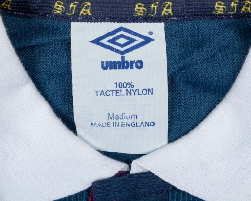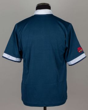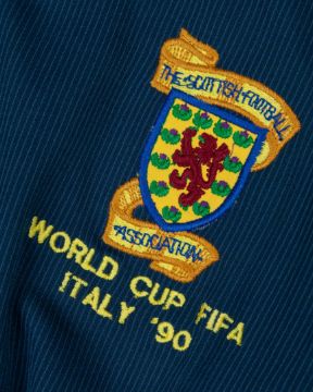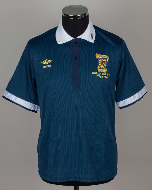 Blue Scotland FIFA World Cup short-sleeved shirt, 1990, Umbro, Medium, with button-up collar and embroidered badge inscribed THE SCOTTISH FOOTBALL ASSOCIATION WORLD CUP FIFA ITALY '90