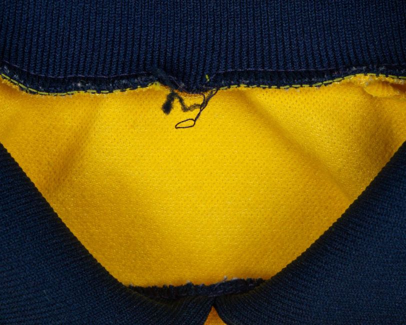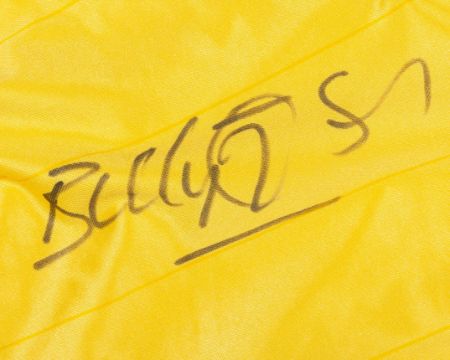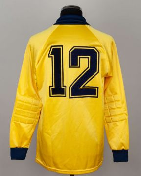 Billy Thomson yellow and blue No.12 Scotland v. Northern Ireland goalkeepers shirt, 1981, Umbro, size N/A, with crew-neck collar and embroidered badge inscribed THE SCOTTISH FOOTBALL ASSOCIATION, the front of the shirt autographed by Billy Thomson