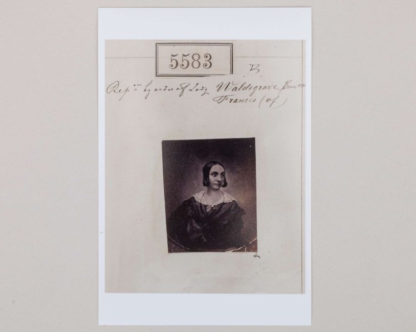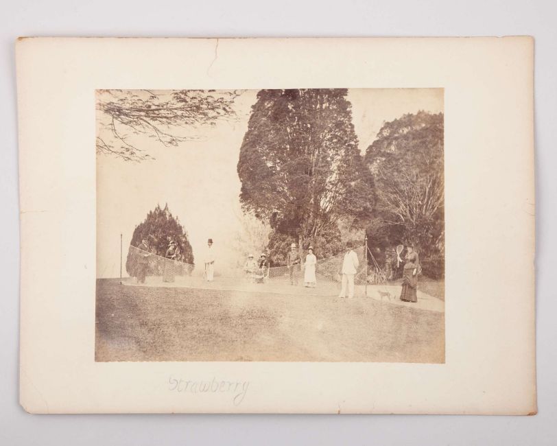 a period sepia-toned photograph of a lawn tennis party at Strawberry Hill House, Twickenham, Middlesex, the lady seated behind the net being Frances, Countess Waldegrave (1821-1879) the owner of Strawberry Hill House and, most interestingly, recorded as the first person in the French & Co. Day-Book to purchase a “Large Set Tennis £10-10-0”, on 6th July 1874, the following July 1875 the Countess hosted a Garden Party at Strawberry Hill House attended by The Prince and Princess of Wales when “the lawn was arranged for tennis”, the image 22 by 28cm., mounted, overall 30.5 by 41cm., the lower margin inscibed in pencil “Strawberry”, tears to margins, image unaffected, slightly bowed, but overall in good condition for its age; sold together with a small reproduction glossy photographic portrait of Countess Waldegrave after the original in the Collection of the National Portrait Gallery dating to the 1840s (2)