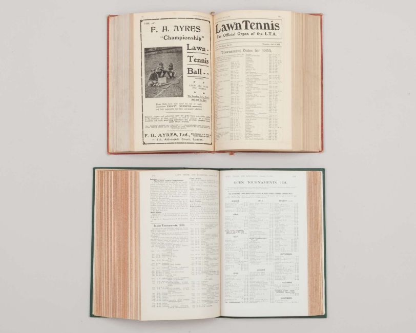 A hard-bound volume of Lawn Tennis and Badminton magazines dating from 1907-08, also containing issues of “Lawn Tennis” and “Amateur Sport Illustrated (over 1,000 pages), complete with original early equipment advertisements, tournament reports and results and articles from journalists such as Wallis Myers covering tennis at Wimbledon and the Olympic Games, (approx 41 Issues) and another collection dating from 1933 and 1934 (over 1400 pages), this large volume covers all the major championships, with numerous reports, advertisements and hundreds of photographs, (over 60 issues)