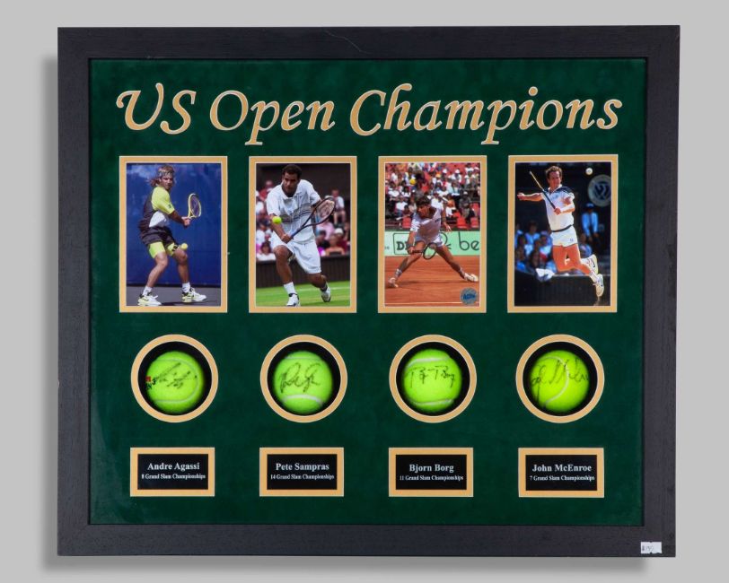 U.S. Open Champions a display of signed tennis balls, comprising Bjorn Borg, John McEnroe, Pete Sampras and Andre Agassi, in common-mount, framed, 55 x 67cm overall