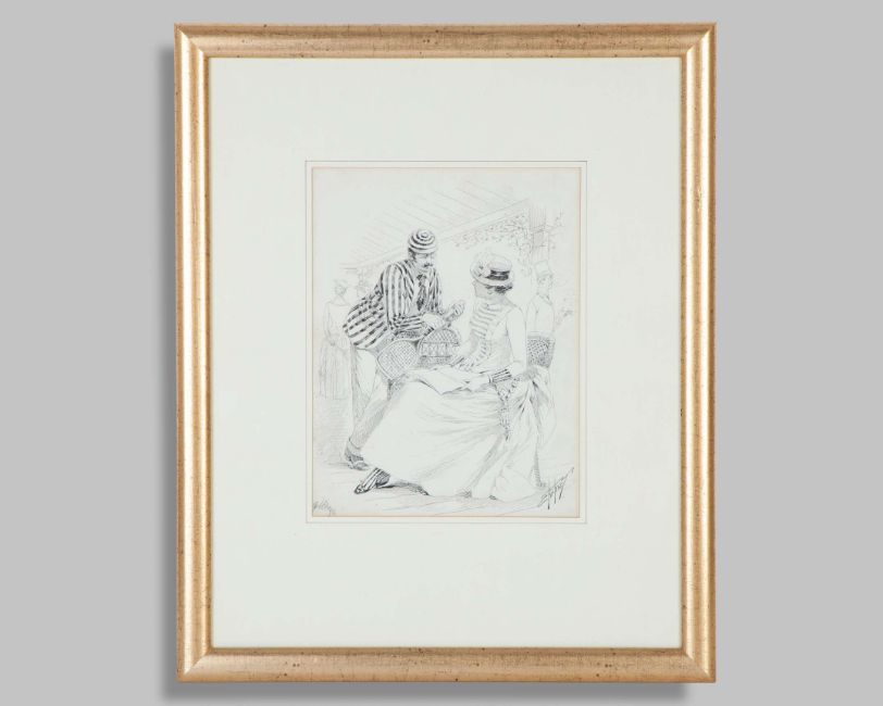 Samuel D. Ehrhart (American 1862-1937) The Tennis Conversation, signed pen and ink drawing, the drawing features tennis players in conversation at Newport Casino (one of them is believed to represent Richard Sears), the image 29 x 22cm, framed and glazed, 55 x 45cm overall