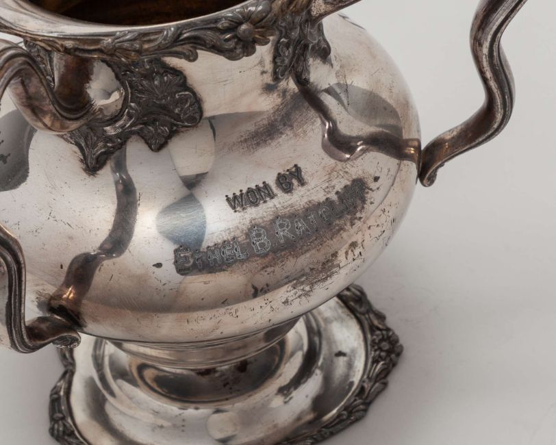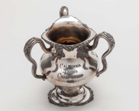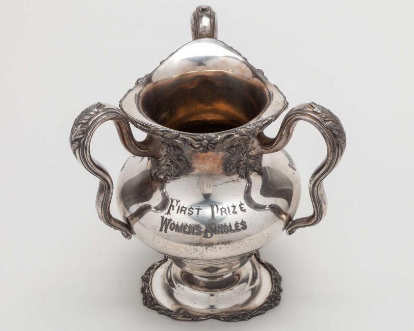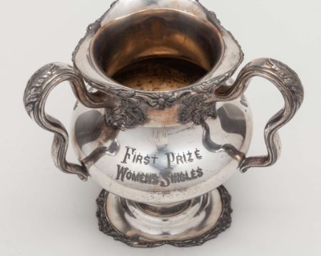 A California Tennis Championship Singles Trophy, dated 1905 won by Ethel B. (Bridget) Ratcliff (aged 22), inscribed First Prize Women's Singles, the trophy was manufactured in quadruple silver plate by the Barbour Silver Company from Hartford, Connecticut, 22cm high, with 10 pages of biographical/tennis career notes.