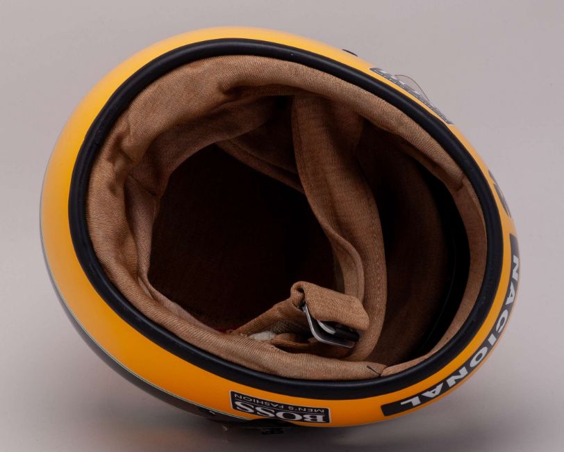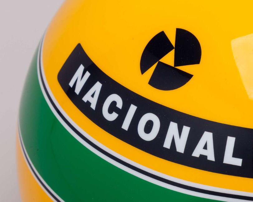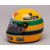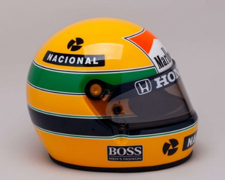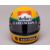 This replica captures the exact look of the helmet Ayrton used throughout the 1989 Formula One season, featuring the iconic bright yellow base with green and blue stripes. Also showcasing the Honda, Marlboro, and McLaren branding.