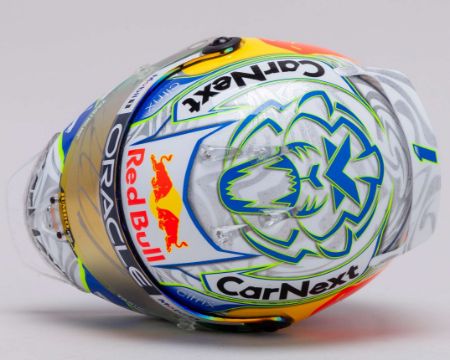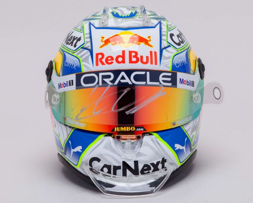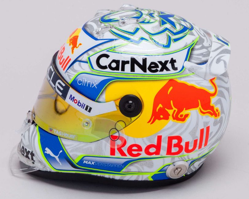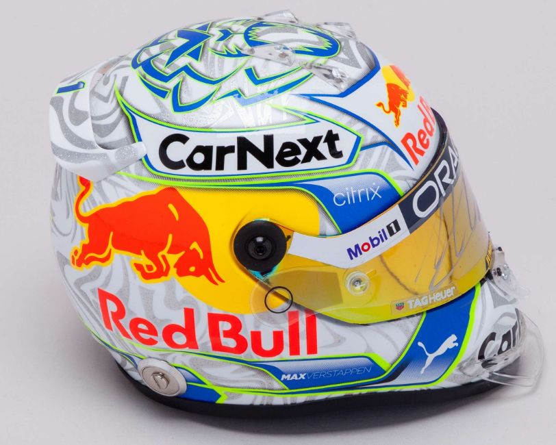 This Max Verstappen 2022 Red Bull signed 1:2 scale Schuberth helmet is a detailed replica of the special edition design worn during the Austrian Grand Prix at Spielberg.