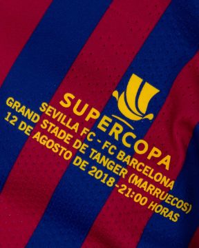 Lionel Messi garnet and blue match-issued No.10 Barcelona v. Sevilla Supercopa Final short-sleeved shirt, 2018-19 home, Nike, L, with v-neck collar and printed badge, with SUPERCOPA SEVILLA FC - FC BARCELONA GRAND STADE DE TANGER (MARRUECOS) 12 DE AGOSTO DE 2018-21:00 HORAS decal, the reverse lettered MESSI, the right sleeve with Supercopa flash
