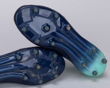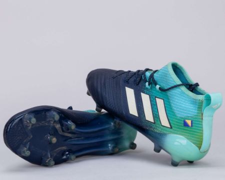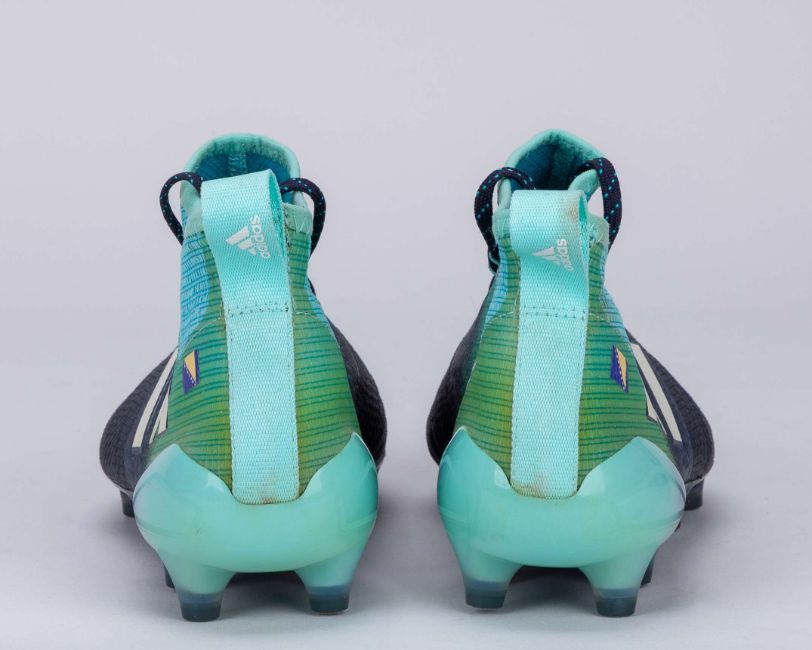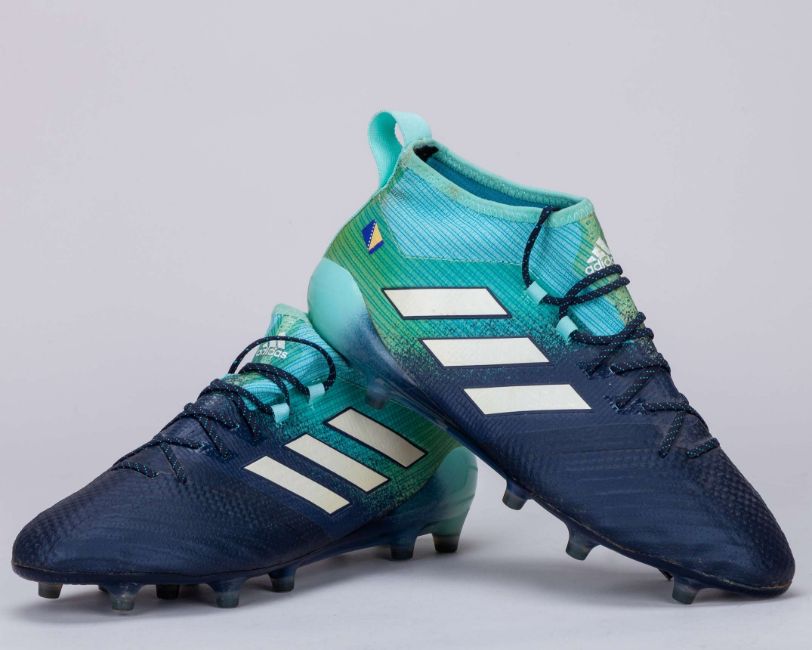 Miralem Pjanic blue Adidas V 17.1 football boots, 2017, L/R 8.25/8 UK, with MIRE (Bosnia & Herzegovina flag) decal on both boots, signs of wear