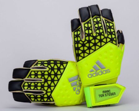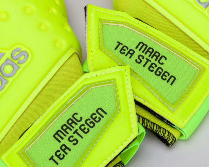 Marc-Andre Ter Stegen yellow and black Adidas goalkeeper gloves, 2015, UK11, with MARC TER STEGEN decal