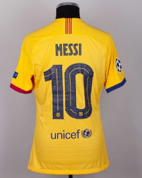 Lionel Messi yellow, garnet and blue issued No.10 Barcelona Champions League short-sleeved shirt, 2019-20 away shirt, Nike, L, with v-neck collar and printed badge, the reverse lettered MESSI, the right sleeve with Champions League flash and the left sleeve with respect and 5 Champions League flashes