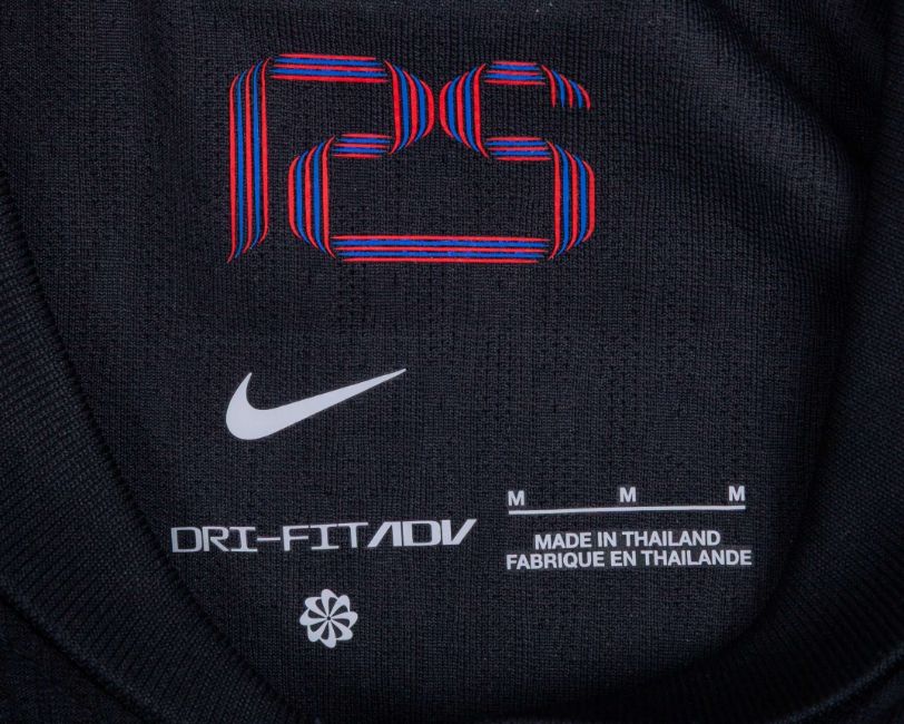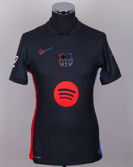 Lamine Yamal black, red and blue issued No.19 Barcelona short-sleeved shirt, 2024-25 away, Nike, M, with v-neck collar and printed badge, the reverse lettered LAMINE YAMAL, the right sleeve with La Liga flash