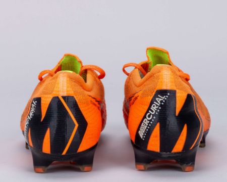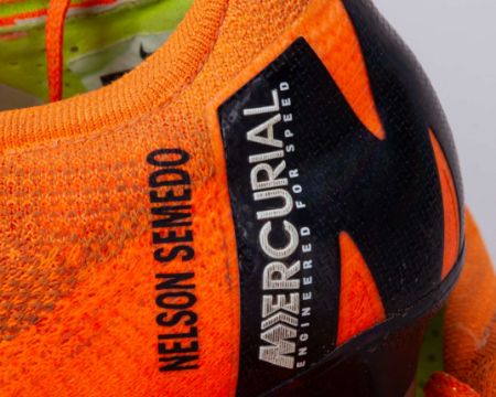 Nelson Semedo orange Nike Mercurial worn football boots, 2018, UK7, with NELSON SEMEDO decal on both boots, with signs of wear, worn in training