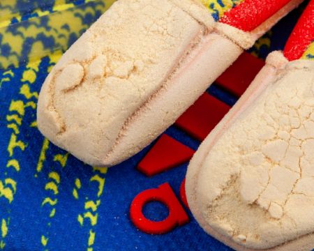 Marc-Andre Ter Stegen blue, yellow and red Adidas match worn goalkeeper gloves, March 2019, UK12, with MTERSTEGEN1 D decal on both straps, with signs of wear, the foam brittle and worn