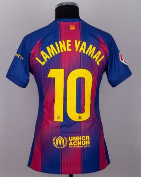 Lamine Yamal garnet and blue issued No.10 Barcelona short-sleeved shirt, 2025-26, Nike, M, with crew-neck collar and printed badge, the reverse lettered LAMINE YAMAL, the right sleeve with La Liga and 2024-2025 Champions flashes