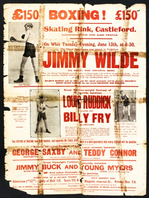 A First World War period boxing poster featuring Jimmy Wilde at the Skating Rink, Castleford, a great rarity but in poor condition, laid down on card, 50 by 37 cm., 19 ½ by 14 ½ in. Jimmy Wilde is billed as meeting three opponents George Senior, Young Stanton and Rufus Dewhurst, Wilde's gloves were to be sold at the event for the benefit of serving soldiers and sailors.