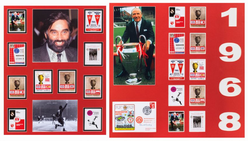 Two framed Manchester United 1968 European Cup Final displays signed by Matt Busby and George Best, the Busby frame signed in ink on a commemorative postal cover, mounted with a colour portrait photo and miniature repros of the programme covers from the campaign, the mount with vertical cut-outs reading 1968, 62cm., 24 ½in. square; the Best signature on a 9 by 6in. square; the Best signature on a 9 by 6in. colour photo. mounted together with photos and miniature repros of the programme covers from the campaign, 68 by 58cm., 26 ¾ by 22 ¾in. (2)