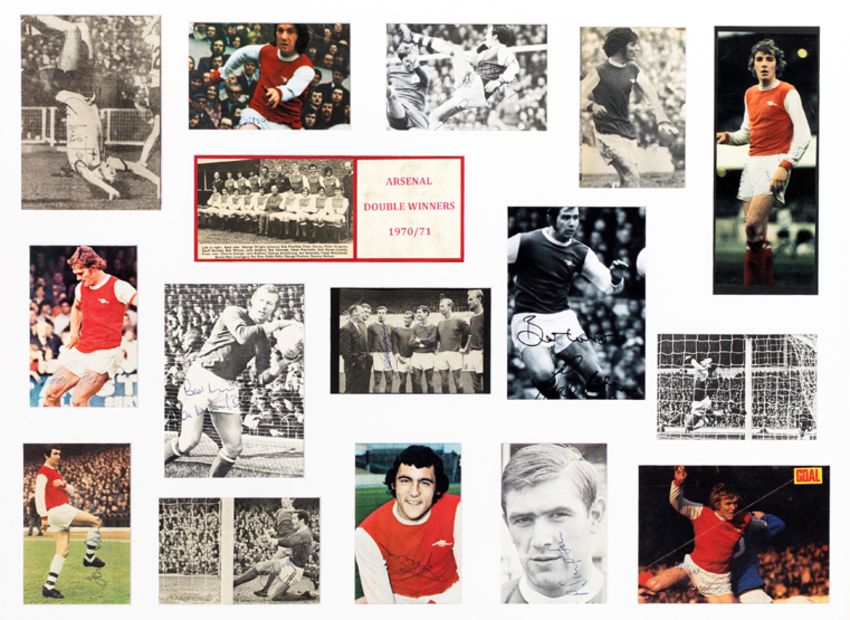 A signed pictorial montage of the Arsenal 1970-71 Double Winners, incorporating pictures signed by George, Rice, Sammels, Armstrong, Wilson, Graham, McNab, Mee, Radford, McLintock, Kennedy, Marinello, Kelly, Simpson, Nelson, Storey and Roberts, mounted, framed and glazed 67 by 87cm., 26 1/2 by 34in.