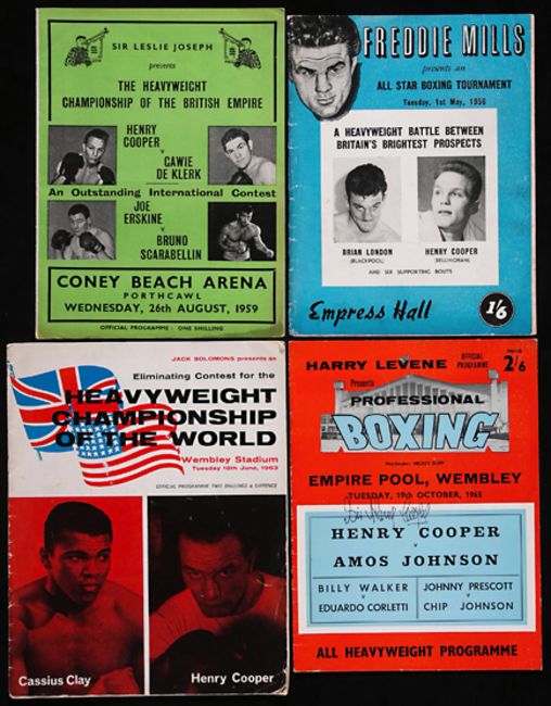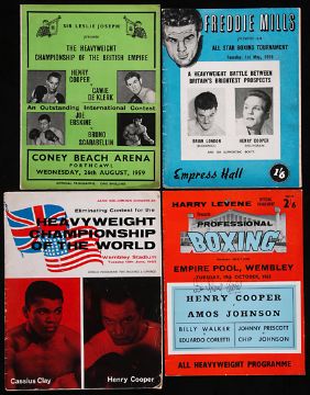 A collection of 37 Henry Cooper Championship Fight programmes, the earliest from a GB v Spain Amateur International 19.11.52, the first professional representation v Denny Ball at Harringay 7.12.54 (fourth career pro fight) & concluding with his final career fight v Joe Bugner 16.3.1971, the Joe Erskine programme 21.3.61 comes with a ticket, the Amos Johnson programme 19.10.65 is signed by Henry Cooper and also comes with a ticket, and the Billy Walker programme 7.11.67 also has a ticket; sold together with a full set of 40 Collectors Cards by Sporting Profiles each depicting an image of a fight programme with extensive text about the fight to the reverse