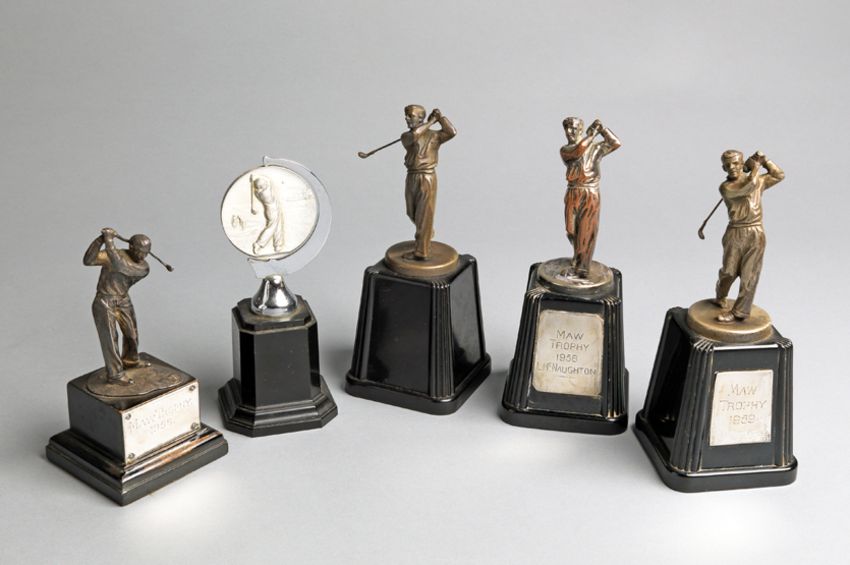 A group of five golf trophies, including three set with plaques inscribed for the Maw Trophy with dates for 1956, 1958 & 1959 and one named to L McNAUGHTON
