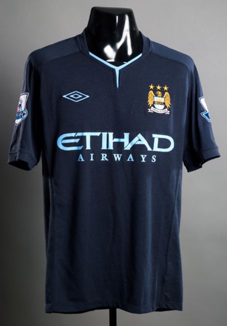 Patrick Vieira: a dark blue Manchester City No.24 away jersey, short-sleeved, Premier League badges, the reverse lettered VIEIRA; sold with a COA dated December 2013 (2)