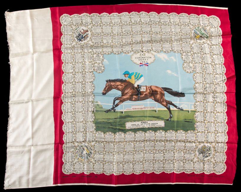 A ladies silk scarf commemorating the victory of Sir Victor Sassoon's Pinza ridden by Sir Gordon Richards in the 1953 'Coronation' Derby, in fine unused condition, border hem unfinished