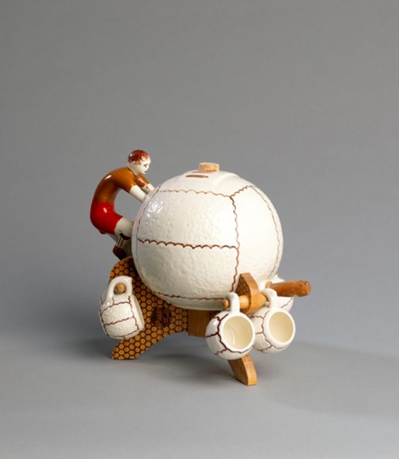 A continental ceramic liqueur set with football design, the main vessel shaped as a football with a player as a handle, wooden tap and stand for hanging six drinking cups, height 20cm., 8in.