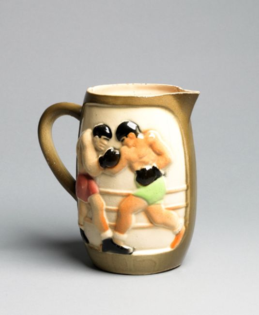 A French pottery jug depicting a boxing match, decorated in colour on both sides, cracked, marked F.B. ''boxe'' to base, 18.5cm., 7 1/4in.
