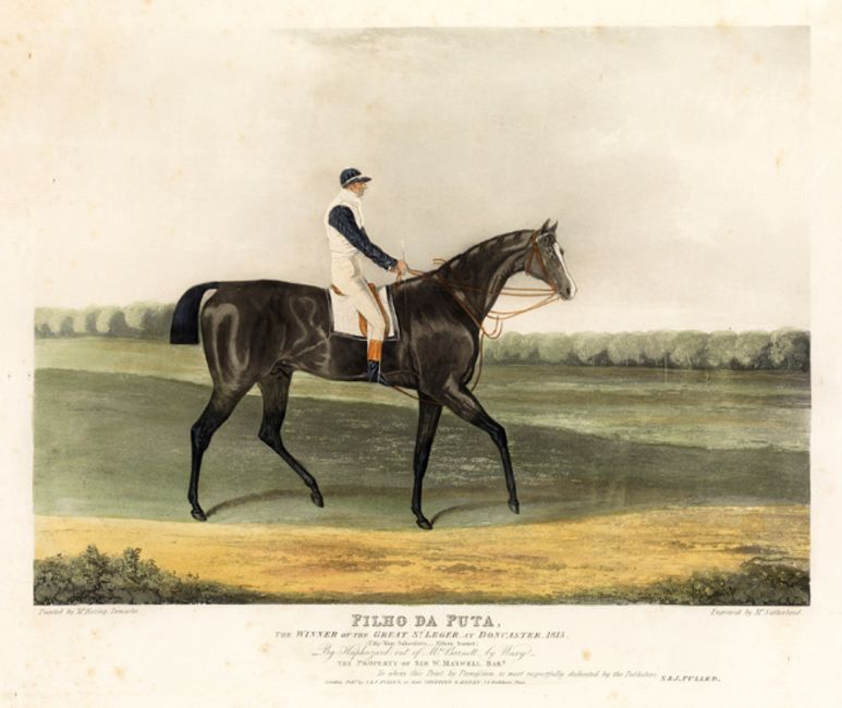 After John Frederick Herring senior (1795-1865) FILHO DA PUTA, WINNER OF THE 1815 St. LEGER aquatint, engraved by M. Sutherland, from the St. Leger Winners series, published by S & J Fuller, framed and glazed, overall 50 by 65cm., 20 by 25½ in.