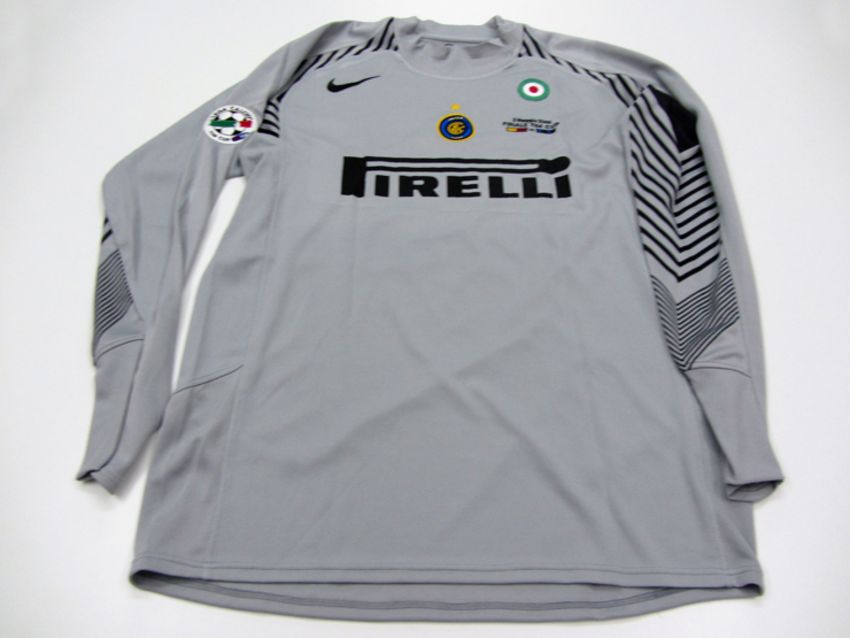 Julio Cesar: a grey FC Inter No.12 goalkeeping jersey from the 2006 Italian Cup final, long-sleeved, Lega Calcio TIM Cup & circular Italian Cup badges, inscribed 3 MAGGIO 2006, FINALE TIM CUP, narrow blocks representing the colours of the teams in the final tie, the reverse lettered JULIO CESAR Provenance: Former FC Inter Team Director