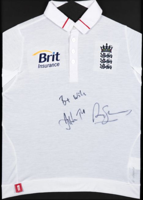 An England 2010 Ashes series replica cricket shirt double-signed by Andrews Strauss and Jonathan Trott, signatures in black marker pen, mounted, framed & glazed, 87 by 62cm., 34 by 24 1/2in.; sold together a letter of provenance from the MCC & an Andrews Strauss signed 2009 Benefit Year brochure (3)