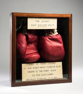 The gloves worn by Henry Cooper when he became the first boxer to put Cassius Clay down on the canvas during their match at Wembley Stadium 18th June 1963, a pair of red boxing gloves by Baily's of Glastonbury, mounted in the glass fronted wooden case in which the gloves were mounted and displayed at the famous Thomas A'Beckett pub in the Old Kent Road, London, with two title plaques inscribed THE GLOVES THAT DID NOT SPLIT; USED BY HENRY COOPER, IN HIS FIGHT WITH CASSIUS CLAY, HENRY IS THE FIRST MAN TO PUT CLAY DOWN, WEMNLEY STADIUM, 17.6.63 [sic], 41 by 36 by 15cm., 16 by 14 by 6in.; sold with a file of papers relating to the provenance including a photograph of Henry Cooper presenting the gloves to a Sunday Express reader who won them in a newspaper competition in 1996, two letters from the Sunday Express to the competition winner, and a Phillips auction catalogue from 11th May 1996 relating to the sale where the newspaper purchased the gloves Please note that the creator of the display case plaque mistakenly listed the fight date as the 17th June, rather than the 18th. Cooper and Clay met at Wembley Stadium, London on the 18th June 1963 in what was billed as "An eliminating contest for the Heavyweight Championship of the World". In the final moments of the fourth round Cooper famously dropped Clay with his trademark left hook, known as "Enry's 'Ammer". Unfortunately for Cooper, his opponent's armpit caught in the ropes going down, which prevented his head from striking the canvas covered boards which made up the floor of the ring (something which could easily have knocked him unconscious). Clay stood up and started slowly towards Angelo Dundee who - in violation of the rules - guided him into the corner. At first Dundee talked and slapped Clay's legs, but after a still-dazed Clay misunderstood and tried to get off the stool Dundee used smelling salts in a serious violation of the rules. (British rules did not allow any stimulant but water.) Dundee has since claimed to have opened a small tear in one of Clay's gloves and told the referee that his fighter needed a new pair of gloves, thus delaying the start of the 5th round. Cooper always insisted that this delay lasted anywhere from 3-5 minutes and denied him the chance to try to knock Clay out while he was still dazed, although tapes of the fight suggest it only gained Clay a few extra seconds. Cooper started the 5th round aggressively, attempting to make good his advantage, but a recovered Clay effectively countered and Cooper was hit high on the face with a hard right which opened a severe cut under his eye. Referee Tommy Little was ultimately forced to stop the fight due to Cooper's excessive bleeding, with Clay declared the winner by TKO. Provenance: On the first floor of the Thomas a Beckett pub was a gym where Sir Henry Cooper former British, European and Commonwealth Heavyweight Champion trained six days a week. Beryl Cameron-Gibbons was Europe's only female boxing promoter and landlady of the Thomas a Beckett for sixteen years until 1983, though she had lived there for twenty three years. In 1984 the pub licence was taken over by the ex boxer/manager/promoter Gary Davidson who also turned the pub into a museum and boxing hall of fame, housing a collection of memorabilia including the gloves being sold in this auction. When Billy Aird, the former professional boxer, took over the Thomas a Beckett, the boxing collection was consigned to Phillips Auctioneers and sold on 11th May 1996. The Cooper gloves were sold as lot 112 and purchased by Sunday Express Newspaper who offered them the following month as a reader's competition prize. The gloves were personally presented to the winner by Henry Cooper.