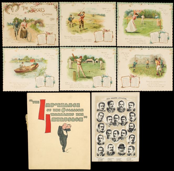 Sporting prints, folder of sporting lithographs published by The Motor magazine circa 1937 titled "The Importance of the Occasion Warrants the Intrusion" featuring amusing moments in golf, chess, horse racing, and cricket, all with bubble captions advertising the magazine; sold together with 'The Sports Calendar for 1899' printed in Bavaria for the British market, six two month leaves with colourful leaves featuring cycling, golf, lawn tennis, boating, cricket & football; and a Boys Own Paper supplement print titled "Our Leading Athletes"