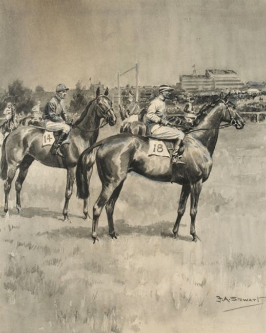 Frank Algernon Stewart (1877-1945)THE DERBY 1925: MANNA S.DONOGHUE, ZIONIST, B.CARSLAKEsigned, watercolour & bodycolour en grisaille, the image 41 by 33cm., printed title to mount, framed & glazed, overall 66 by 57cm.Provenance:Consigned by the grandson of Dorothy Thomas, a close friend of Steve Donoghue.